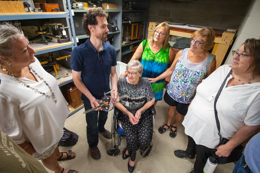 In late August, Anne, Kralkay and other members of their family—Sharon Geall, Bev Suiker, Val Plummer and Kirk Kralkay—came to campus to see the X-ray tube in its new home in the Physics Artifacts Collection.