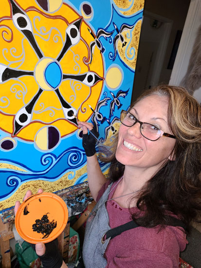 Leah Marie Dorion works on her painting, Goose Moon, in 2021. (Photo: Louis Lafferty Photography)