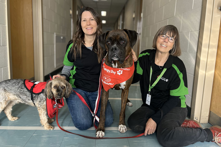Stumborg, who supported research activities on campus when she worked as an employee in the College of Medicine, learned more about the PAWS Your Stress program after watching Dell and other therapy dog handlers give a presentation at USask about their work. That presentation focused on research that explored the value of service dogs for Canadian veterans, and it inspired Stumborg. She approached Dell after the presentation to talk about getting involved with PAWS Your Stress, and the rest is history.