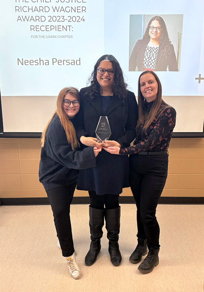 Persad was deeply involved in the community while a USask student, as a member of the Law Students’ Association on campus. She also created a mentorship program within one of the first-year law courses to help bridge the gap between upper-year and first-year students. Persad also continued her interest in Access to Justice through an internship with CREATE Justice, a community organization run through the University of Saskatchewan.