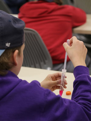At the end of the activity, VIDO scientists dropped another solution into each tube. Any tube that had contacted the infected liquid turned bright purple.