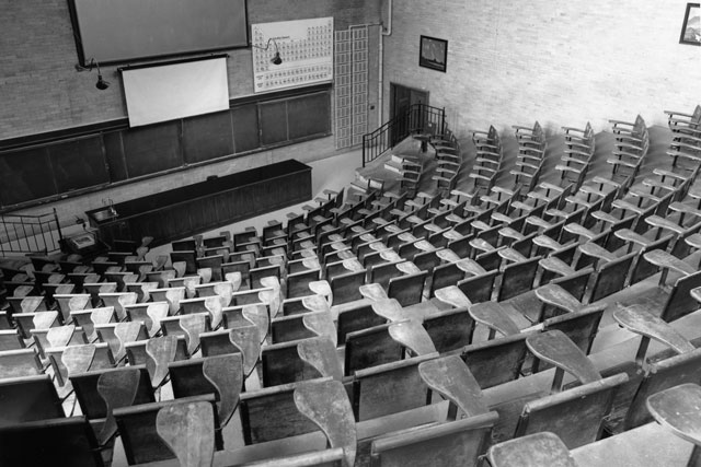 Spaces that have seen more change during the last century are the chemistry laboratories, which have had major updates to meet modern safety and performance standards. The original granite and porcelain laboratory sinks are long gone. Visitors no longer have to walk through a professor’s lab to reach their office.