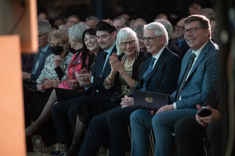 Many special guests and government and community leaders attended the president’s community farewell reception on Dec. 4, including USask honorary degree recipient Ellen Remai (LLD’23), Remai Modern’s lead patron; Saskatoon’s mayor, Cynthia Block; and Saskatchewan’s minister of advanced education, Ken Cheveldayoff. The farewell event’s speakers included Saskatchewan Premier Scott Moe (BSA’97); Charlie Clark, who served as Saskatoon’s mayor during much of Stoicheff’s presidency; USask Vice-President of University Relations Cheryl Hamelin (BSHEC’88); Chancellor Emerita Grit McCreath (BEd’91); and USask alumnus Max FineDay (BA’15), a former University of Saskatchewan Students’ Union (USSU) president, as well as Stoicheff and Richards. Banda also read remarks on behalf of Chancellor Emeritus Blaine Favel (BEd’87, LLD’12).