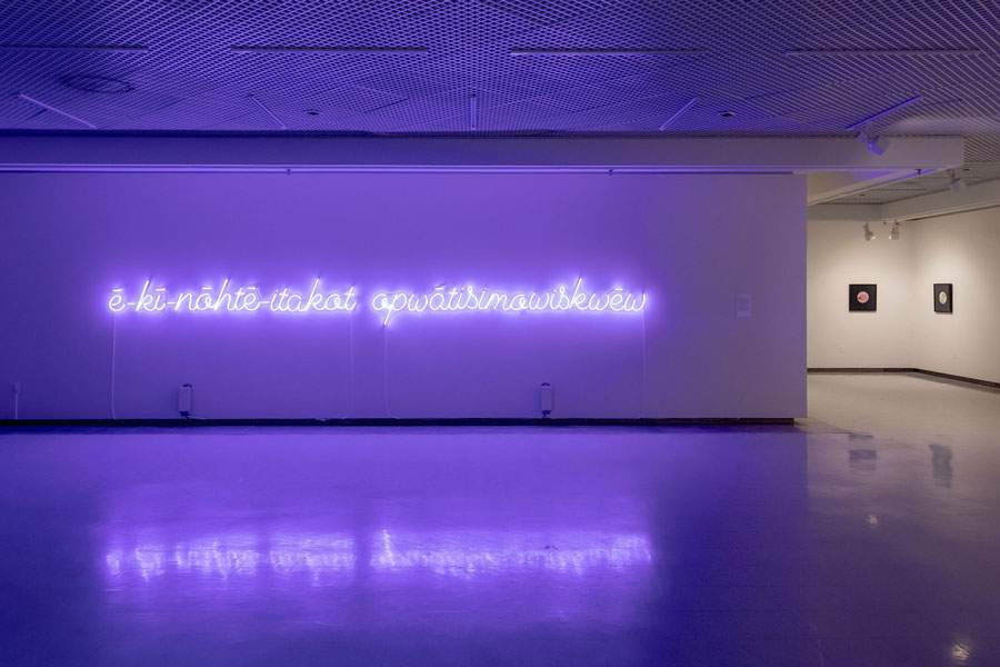 Joi T. Arcand (BFA’06), an artist from Muskeg Lake Cree Nation in Saskatchewan who currently resides in Ottawa, Ont., has exhibited across Canada, the United States, and Europe. She engages in Indigenous language revitalization by inserting nēhiyawēwin (Plains Cree) language and imagery into public spaces. Through ē-kī-nōhtē-itakot opwātisimowiskwēw (she used to want to be a fancy dancer), Arcand reflects on her short-lived experience powwow dancing in her youth, and on her long-lost dream of wanting to be a ballerina. Arcand is currently a member of the Ottawa-based art and curatorial collective Wolf Babe. Alongside fellow USask graduate Felicia Gay (BA’04, MA’11), Arcand previously co-founded Red Shift Gallery, a Saskatoon presentation space for contemporary Indigenous art. From 2012-24, Arcand also served as the founder and editor of the Indigenous art magazine kimiwan, and she was shortlisted for the prestigious Sobey Art Award in 2018. In 2024, she was the recipient of ohpinamake, a $10,000 prize for Indigenous artists presented by USask in collaboration with donors Jim and Marian Knock.