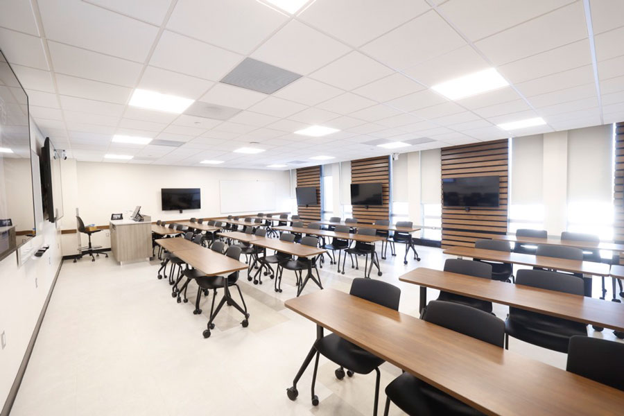 With a generous $500,000 donation from Berg, the revitalized space can now function as either an active learning-style or traditional, front-of-room classroom, with flexible furniture, seven digital display screens, and a teaching console that can mirror and project onto any screen in the room. The room also features enhancements to lighting and acoustics.
