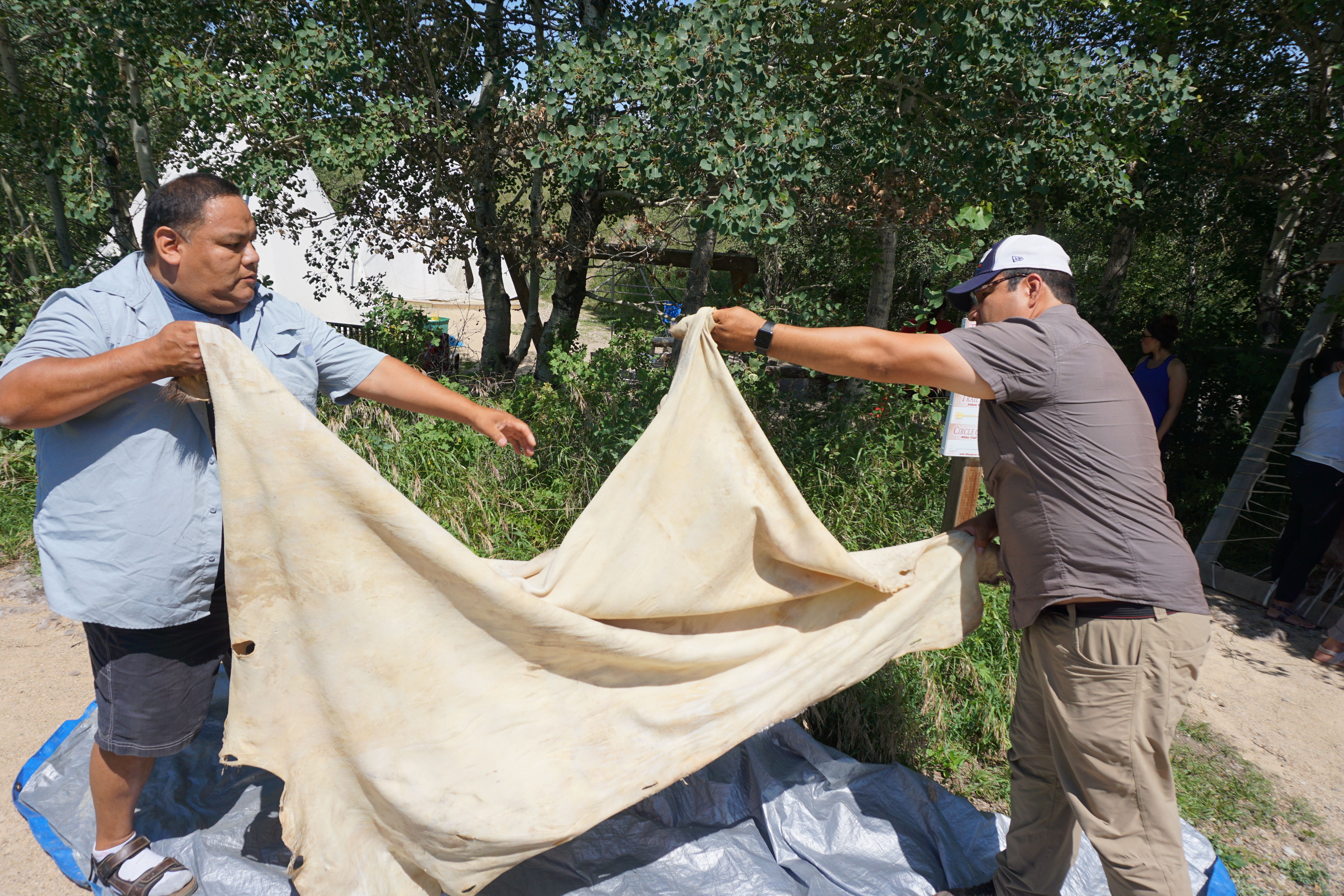 students shake the hide, stretching it out.