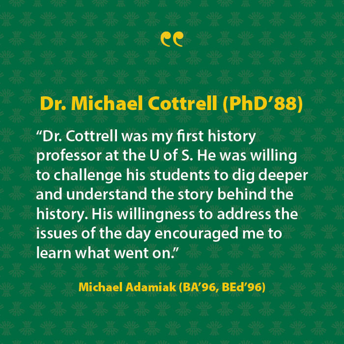 “Prof. Jack Coggins was my incredible 1st year history teacher, who taught classes not only in Saskatoon but made the weekly drive to Yorkton to teach classes through the Parkland Regional College where I was attending. When I first entered university in 2003, I'd planned to go on to Regina for journalism but taking Jack's classes in European history and experiencing his passion and energy for the course material made me completely fall in love with the History program and change course to go on to Saskatoon to continue taking history classes with him. We had many passionate conversations around the course material as well life advice, juggling work, living alone for the first time - he truly was a mentor that fostered my lifetime love of learning. Moving to Saskatoon and completing my history degree, I went on to meet my (now) husband and build my life here while continuing with subsequent university programs and I can't thank him enough for being so genuinely interesting, passionate and kind. Definitely a solid gold soul.”