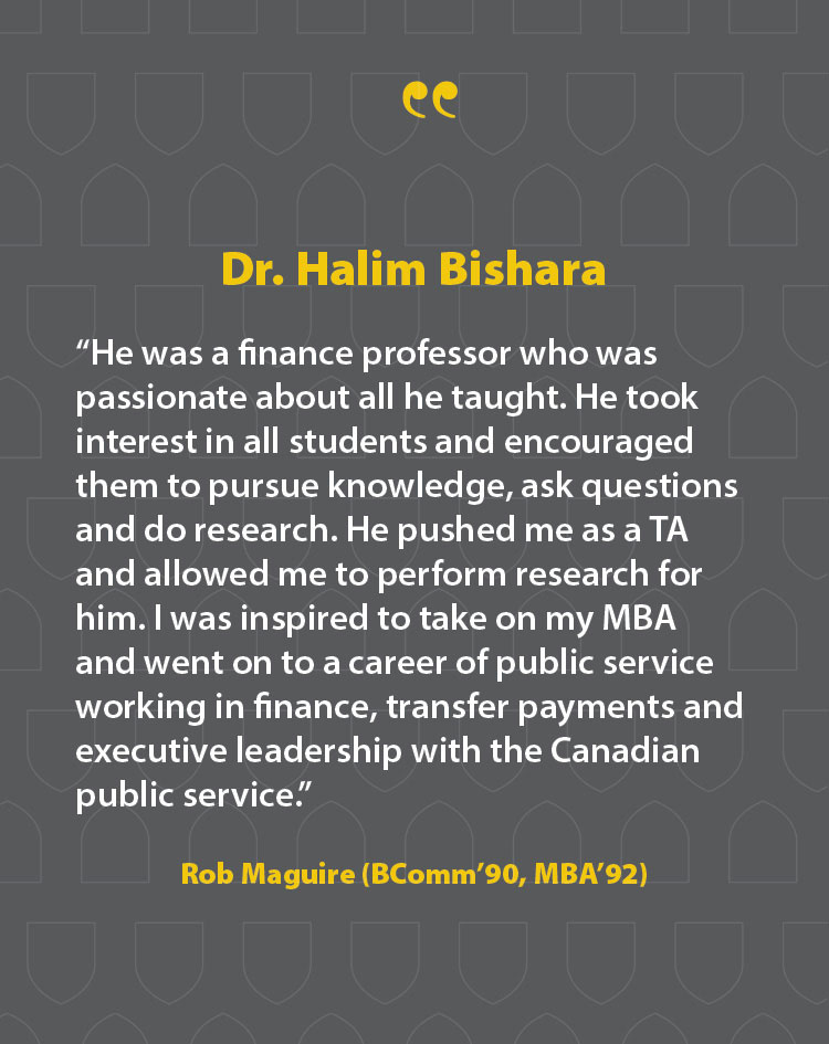 Professor Saleh’s soft and warm side probably surprised those of us who first heard his voice boom across the lecture theatre in the Arts Building during Intro to Marketing with no need of a microphone. Yet the special hints that came with his beaming smile and his signature, “What that means is…” taught us clearly what we should be sure to remember and focus on.